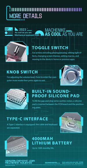 * Built-in double-layer silicone pad helps to isolate unwanted noise and cavity sound for a peaceful typing experience.