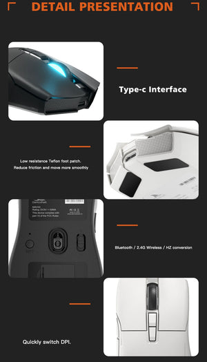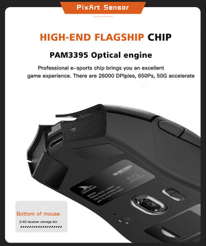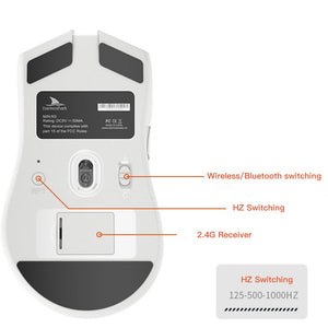 When the bottom three section switch is turned to the G icon, press the left, middle and right buttons at the same time, and the green light of the scroll wheel position flashes to enter the pairing state. At this time, the receiver needs to be inserted. After the connection is successful, the indicator light goes out. (Note: The factory has been paired and it is OK. If the 2.4G has no function, this step can be followed