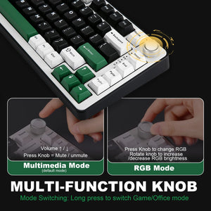 B75 PRO is a compact keyboard with a knob and 82 keycaps. The TKL keyboard has number keys, function keys, and arrow keys at the same time. The multi-function knob of the 75% gaming keyboard enables you to adjust the sound level and backlit fast. Long press the multifunctional knob of this RGB keyboard can switch between gaming and office modes, rotate the knob to adjust the keyboard volume and RGB backlit effects.
