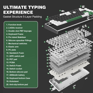 This mechanical keyboard takes full-key hot-swappable sockets and ultra-responsive low latency. The high-quality PCB board of the custom keyboard compatible with 3-pin or 5-pin switches, meets your desired typing feel, whether it's for gaming, typing, or creative endeavors. Pre-lubed linear and tactile switches have a unique design, solid sound, and excellent keystroke feel.