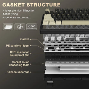 Ultra-portable compact ten-keyless design frees up table space for mouse movement. YZ87 features a gasket structure, with five layers of filling silencer and PORON gaskets filling the gap between the PCB, positioning plate, and mechanical switches, the 87-key TKL mechanical keyboard is flexible and firm by reducing hollow sound and fatigue, It's the ideal choice for a satisfying, low-noise typing experience, whether in an office or gaming environment.
